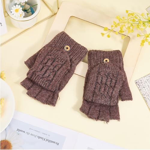 1 Pair Wool Gloves with Mitten Flap Cover Brown Winter Warm Soft Flip Top Insulation Thermal Knitted Fingerless Thumb Hole Wrist Mittens Bulk for Men Women Texting Driving Outings Activity