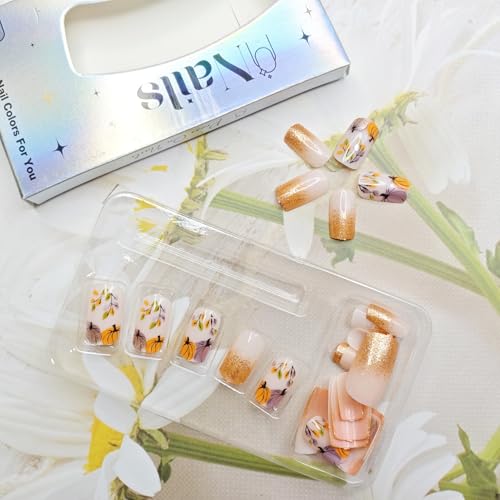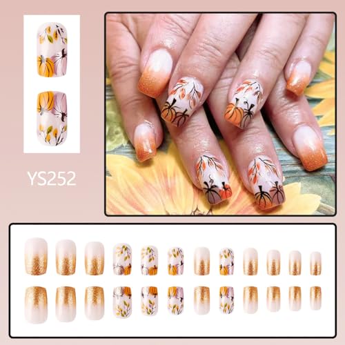 24 Pcs Fall Press on Nails Short Square Fake Nails Gold Glitter Pumpkins Full Cover Glue on Nails Reusable Artificial Thanksgiving Acrylic Nails Design Autumn False Nails for Women Manicure Art Kit
