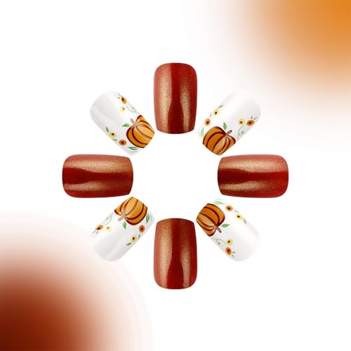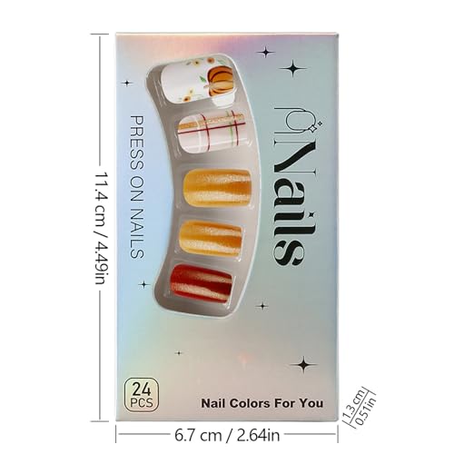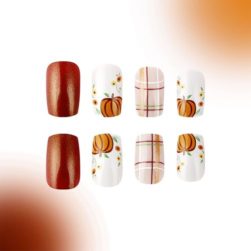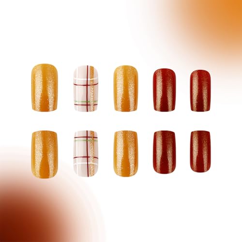 24 Pcs Fall Press on Nails Short Square Fake Nails Orange Glitter Full Cover Glue on Nails Glossy Artificial Thanksgiving Nails Pumpkin Grid Pattern False Nails Autumn Stick on Nails for Women DIY