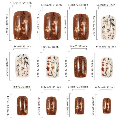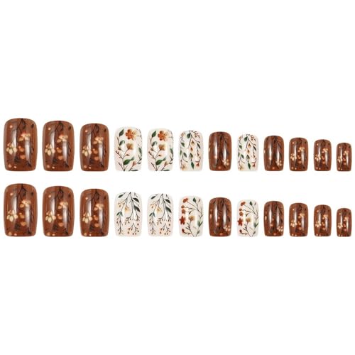 24 Pcs Fall Press on Nails Short Square Shaped Fake Nails with Leaf & Flowers Designs Glossy Brown False Nails Full Cover Autumn Acrylic Nail Stick on Nail for Women DIY Manicuare 24 Pcs
