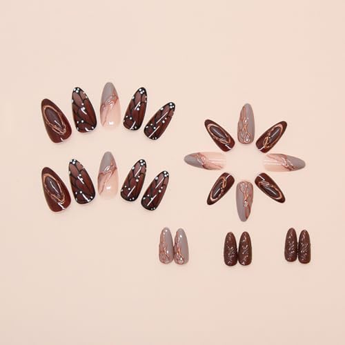 24Pcs Almond Press on Nails Medium Length Butterfly Wings Fake Nails with Ripple Designs Full Cover Brown False Nails French Line Glue on Nails Reusable Fall Acrylic Nails for Women Nail Decor