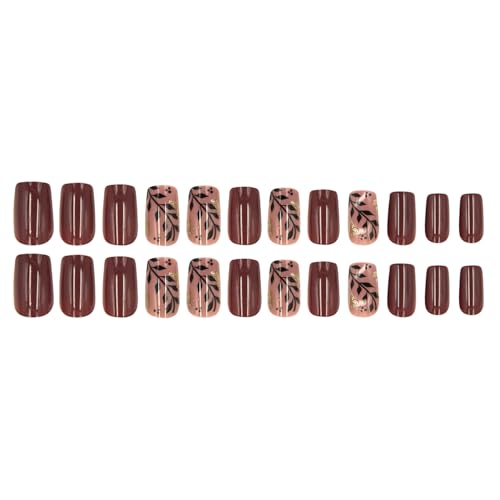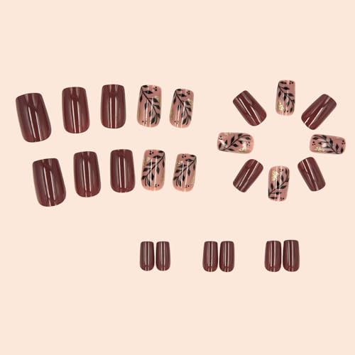 24Pcs Fall Leaf Press on Nails Short Square Fake Nail with Gold Foil Design Brown Autumn False Nail Gradient Glue on Nails Full Cover Stick on Nail Acrylic Nails for Women Girls