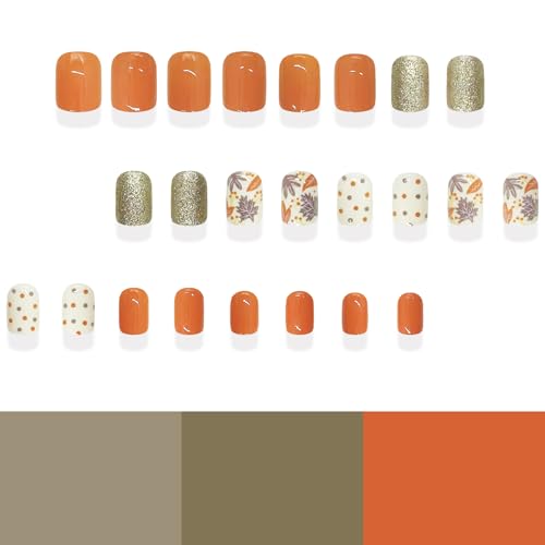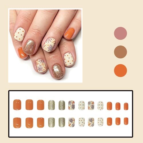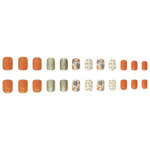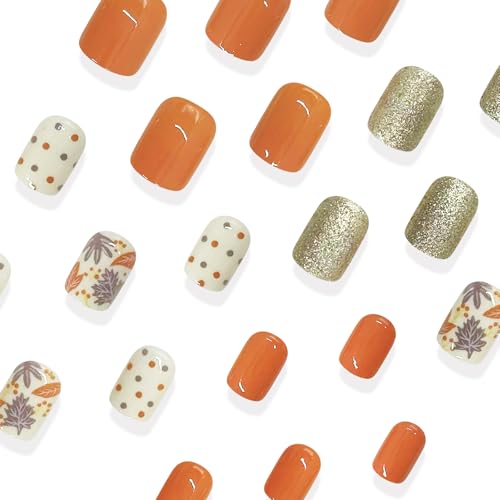 24Pcs Fall Thanksgiving Fake Nails Orange Press on Nails Short Square False Nails with Maple Leaf & Glitter Design Glossy Acrylic Nails Full Cover Stick on Nails for Women Girls Autumn Winter Nail Art
