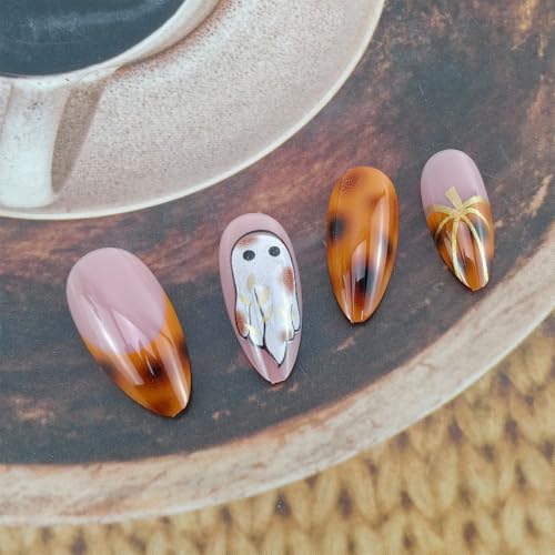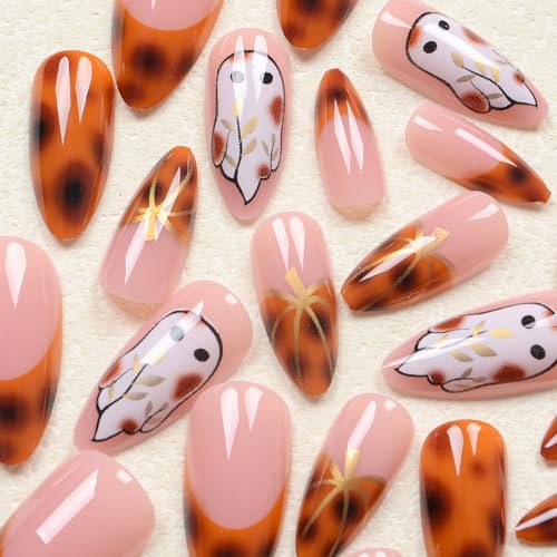 24Pcs Halloween Press on Nails Medium Almond Fake Nails Cute Ghost False Nails Leopard Print Full Cover Glue on Nail Fall Pumpkin Acrylic Nails French Tip Press ons for Women Halloween Manicure