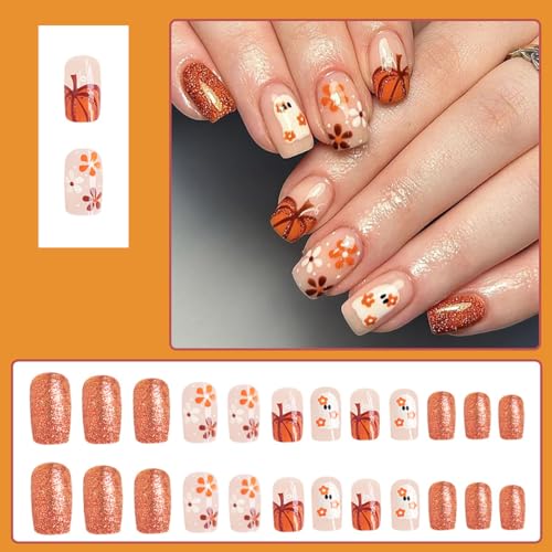 24Pcs Halloween Press on Nails Square Short Fake Nails Cute Ghost False Nail Flower Pumpkin Full Cover Designs Glue on Nail Fall Glitter Halloween Nails Reusable Orange False Nail for Women Girls