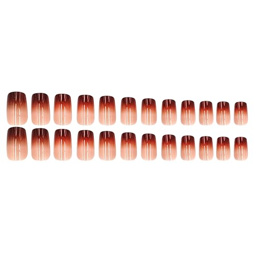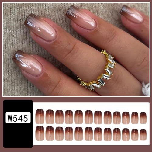 24pcs Medium Square Fake Nails, Brown Gradient Press on Nails with Designs French False Nails for Women Girls Fall Winter Nail Decoration