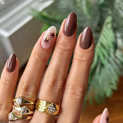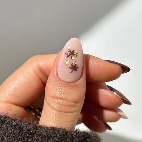 24Pcs Press on Nails Short Almond Fake Nails Fall Brown Nails Press Ons with Gold Glitter Design Maple Leaf Stick on Nail Glossy Full Cover False Nail DIY Glue on Nail for Women and Girls