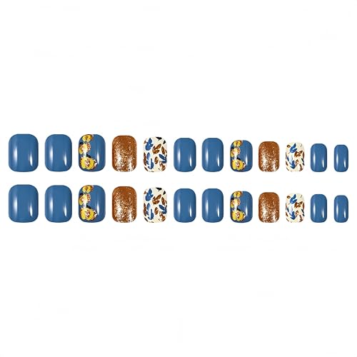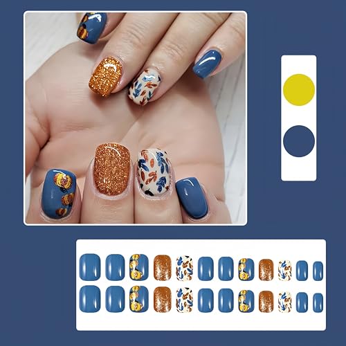 24Pcs Thanksgiving Fall Press on Nails Short Square Fake Nails Autumn Leaves Orange Glitter Acrylic Nails Press ons Reusable Fall Pumpkins Glue on Nail Leaf False Nails for Women Nail Decoration