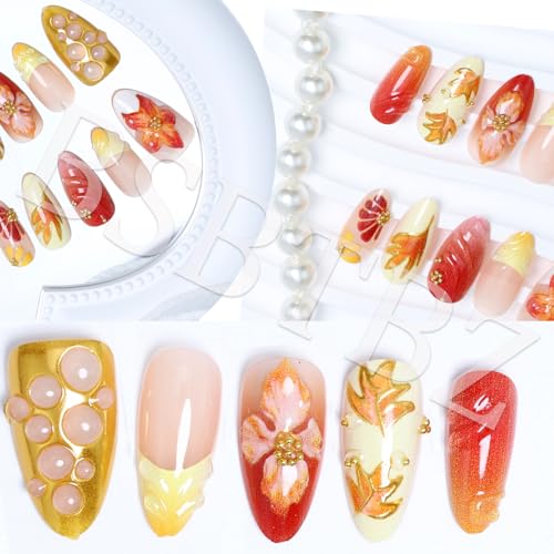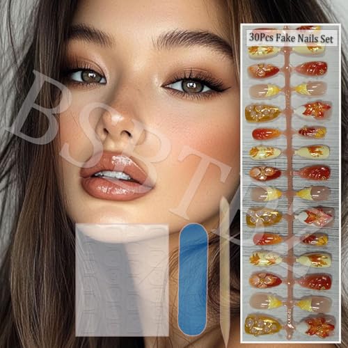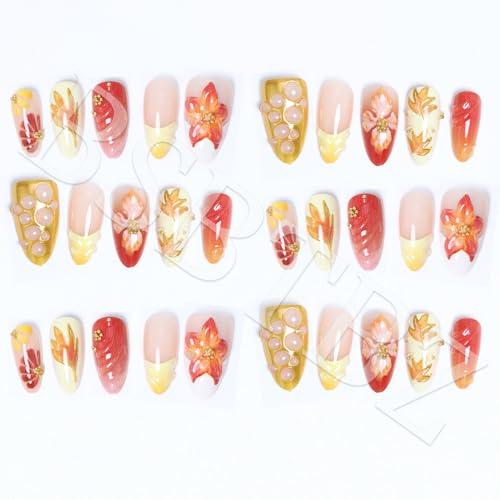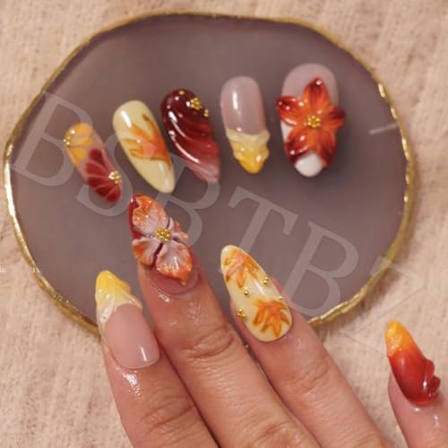 30pcs Fall Maple Leaf Press on Nails Autumn Fake Nail with 3D Floral & Gold Leaf Art in Medium Almond Handmade Thanksgiving Nail Art for Holiday, Vacation, Birthday Nail Decoration for Women