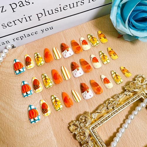 30pcs Fall Press on Nails Medium Almond Fake Nails with 3D Pumpkin Maple Leaf Pine Cones Rhinestones Designs Thanksgiving False Nail Fall Leaves Acrylic Nails Autumn Full Cover Glue on Nail for Women