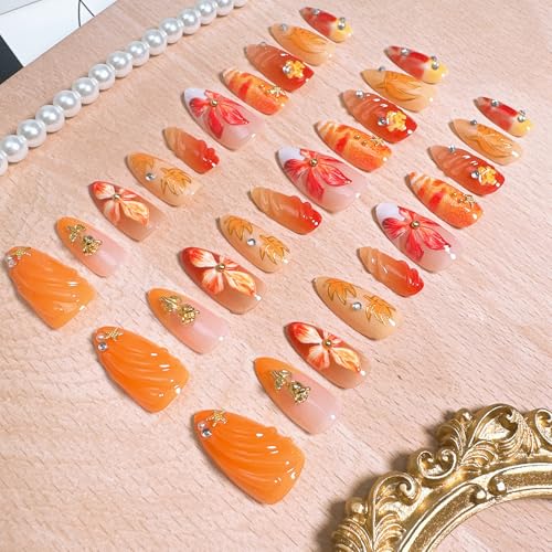 Autumn Press on Nails Almond Medium Maple Leaves Fake Nails for Women Artificial Manicure Decorations.
