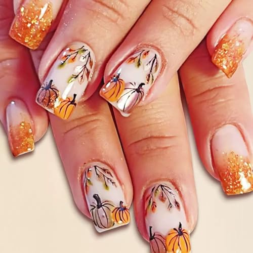 6 Packs (144 Pcs) Fall Press on Nails Medium Square, Almond Press on Nails, with Maple Leaf Design Thanksgiving Day Fake Nails for Women – 12 Sizes, 6Styles