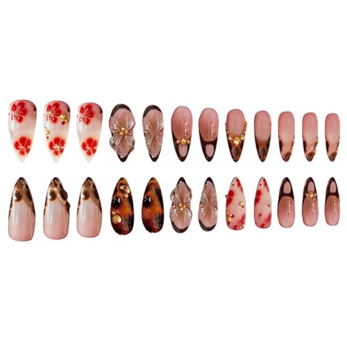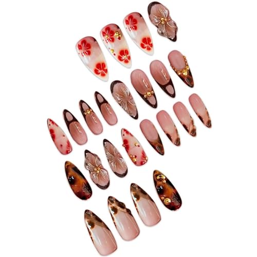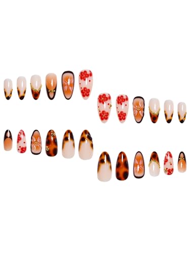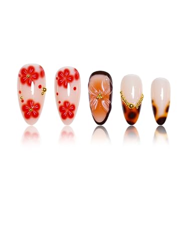 Almond Press on Nails Long Fake Nails French False Nails Brown Artificial Nails with Tortoiseshell and Gold Charm Designs Summer and Fall Nails Cute Acrylic Nails Press ons Red Flowers Handmade Nails