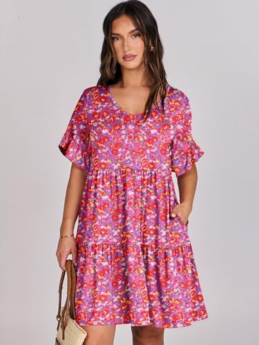 ANRABESS Dresses for Women Summer 2025 V Neck Ruffle Sleeve A Line Tiered Flowy Casual Trendy Mini Beach Dress with Pockets