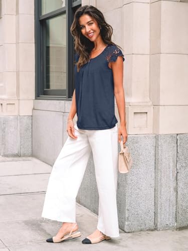 AUTOMET Womens Lace Tops Pleated Short Sleeve Shirts Summer Business Casual Dressy Blouses