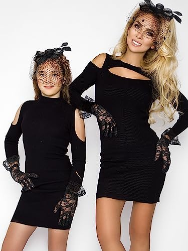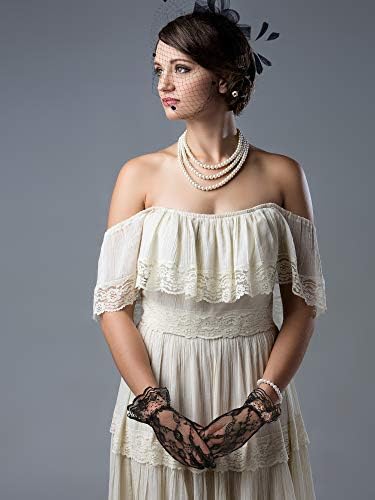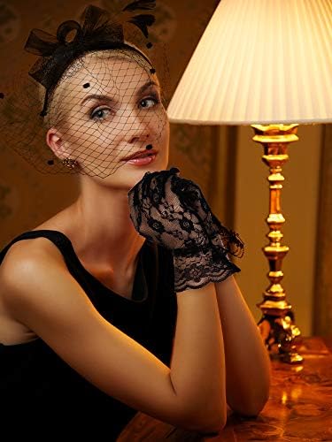 Boao Fascinator Hat for Women Feather Funeral Veil Hat Tea Party Derby Headband and Short Floral Lace Gloves