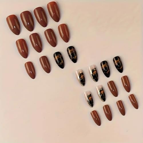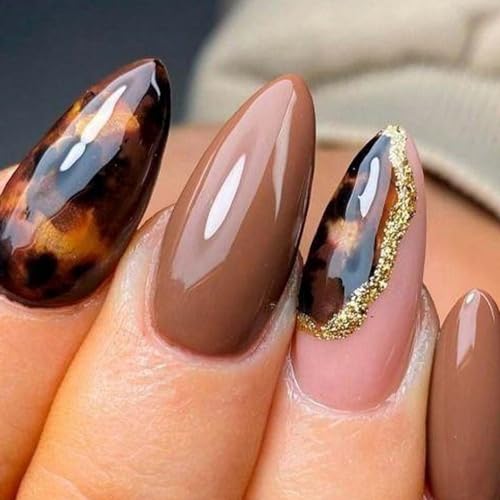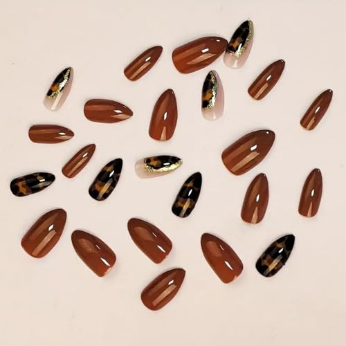 Brown Almond Press on Nails Medium Fake Nails with Leopard&Glitter Designs Fall Almond Shaped False Nails Amber Acrylic Nails Glossy Stick on Nails for Women 24Pcs