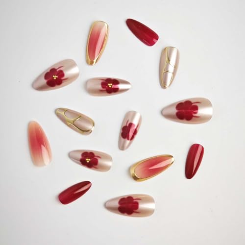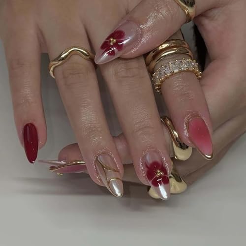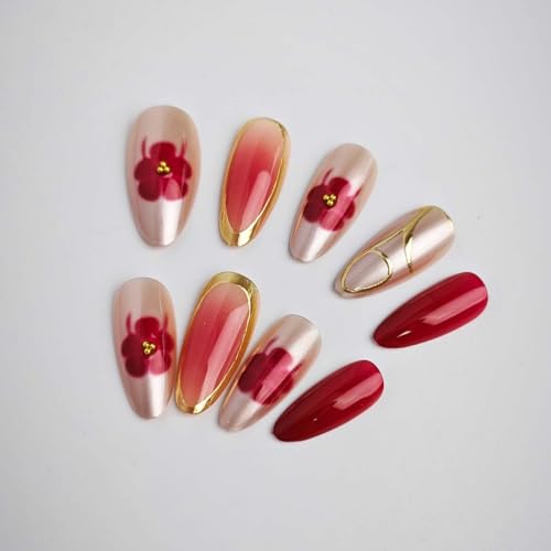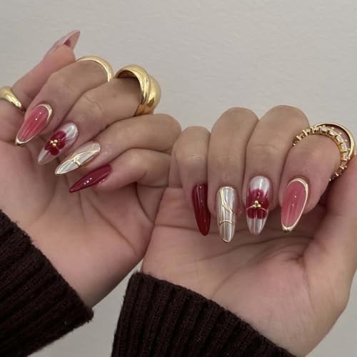 Burgundy and Gold Press on Nails Almond Fake Nails Fall False Nail Press ons with Red Flower,Gold Metallic Design Reusable Artificial Nail Glossy Full Cover Stick on Nails for Women Manicure 24 Pcs