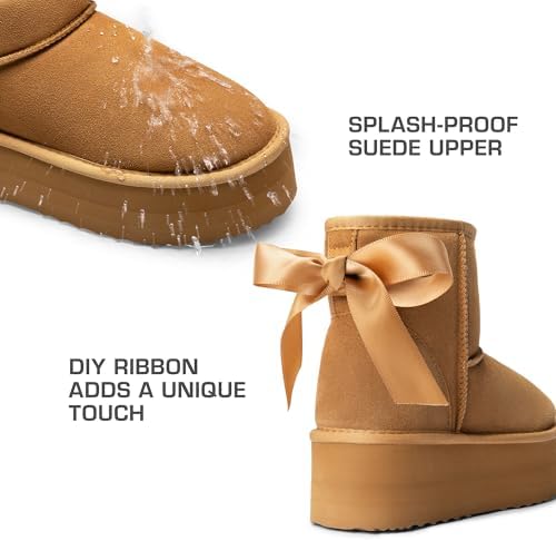 DREAM PAIRS Genuine Suede Classic Platform Boots for Women Water Resistant FuzzyClassic Ankle Winter Snow Low Boots with DIY Bows Faux Fur Lining Memory Foam Anti-Slip