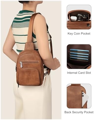 FADEON Sling Bags for Women Crossbody Bags, Designer PU Leather Sling Purse Multi-Pocket Packs with Card Slot Purse Brown