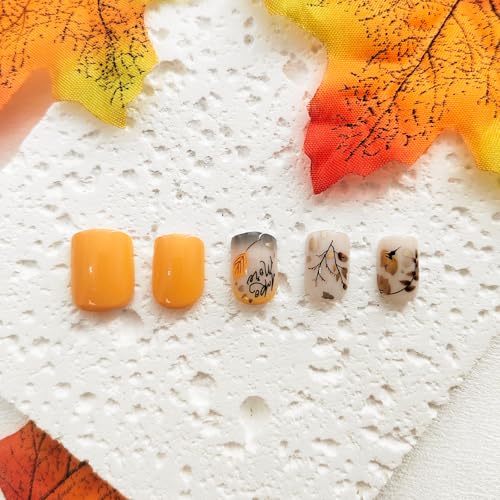 Fall Fake Nails Short Press on Nails Square Yellow Leaves Full Cover Design Glue on Nails Autumn Maple Leaf Acrylic Nails Thanksgiving Nails Winter False Nails for Women Girl 24 Pcs