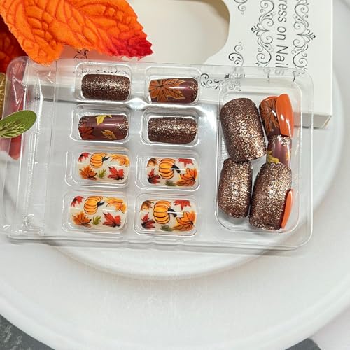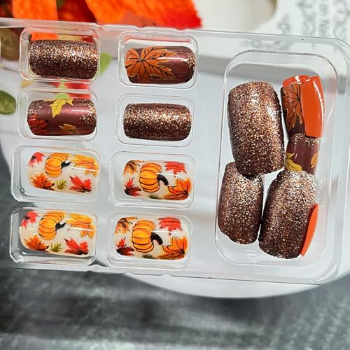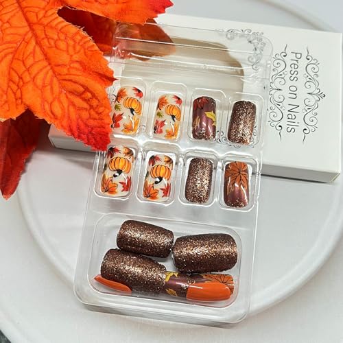 Fall Maple Leaf Press on Nails Medium Square Fake Nails With Pumpkin Designs Autumn Maple Leaves False Nail Thanksgiving Brown Glitter Stick on Nail for Women 24 Pcs