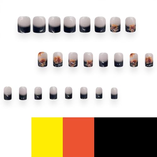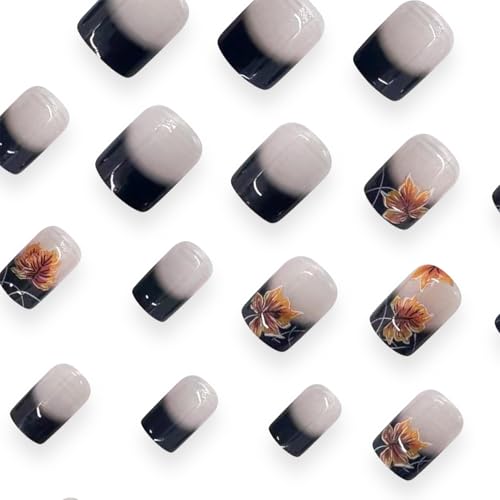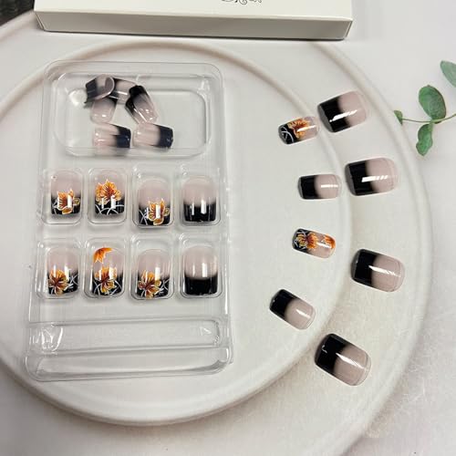 Fall Maple Leaf Press on Nails Short Square Fake Nails Black French Tip False Nails Full Cover Stick on Nails Acrylic Autumn Maple Leaves Artificial Nails for Women Glue on Nails 24 Pcs