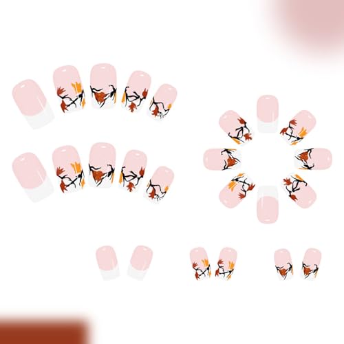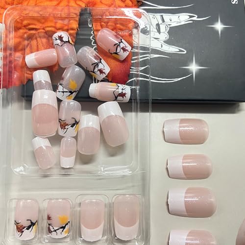 Fall Maple Leaf Press on Nails Thanksgiving White French Tip Fake Nails Medium Square Acrylic Glue on Nail Glossy Autumn Maple Leaves Stick on Nail for Women DIY Manicure