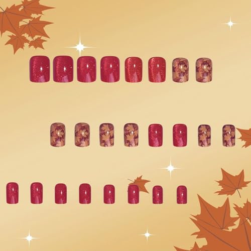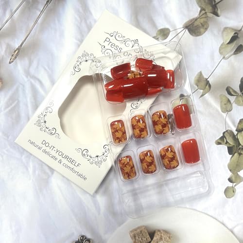 Fall Maple Leaves Press on Nails Short Thanksgiving False Nails Artificial Nails Reusable Autumn Square Acrylic Nails Red Full Cover Glossy Coffin Nails Glue on Nails for Women Festival Nails 24Pcs