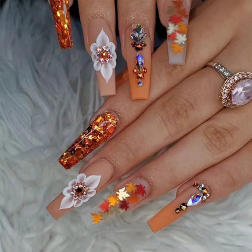 Fall Press on Nails Long Coffin Fake Nails Thanksgiving False Nails with Design Maple Leaves & Rhinestones Glue on Nails Orange Glitter Gradient Autumn Design Stick on Nail for Women Manicure 24Pcs