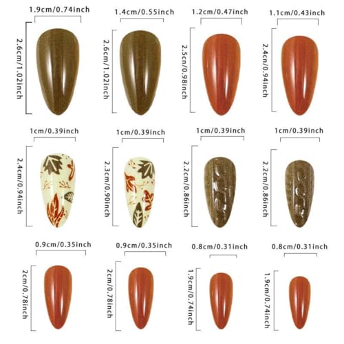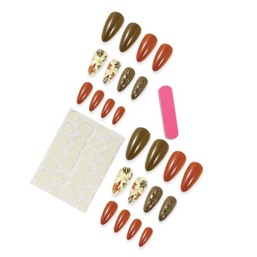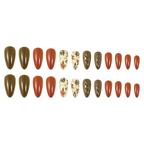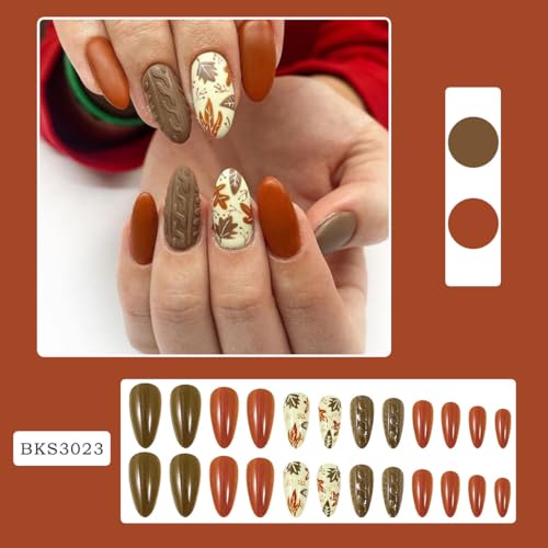 Fall Press on Nails Medium Almond Fake Nails with Design Maple Leaf Glue on Nails Brown Stick on Nails Autumn Thanksgiving False Nails Glossy Reusable for Women Girls Manicure 24pcs
