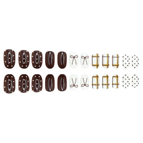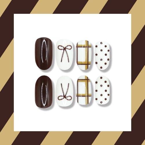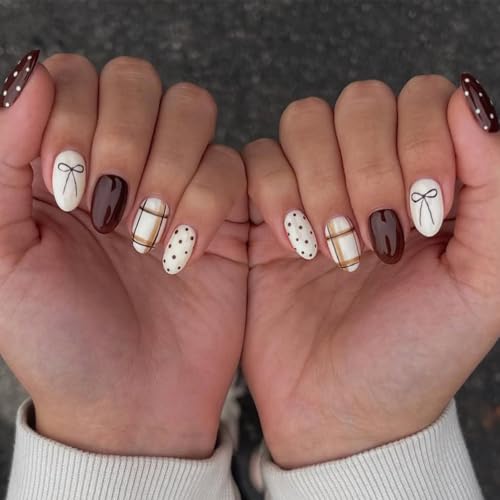 Fall Press on Nails Short Oval, Autumn Brown Nails Press ons with Bow,Polka Dot,Plaid Design Full Cover Stick on Nail for Women Manicure,Reusable | Nail Sticky Tabs | Easy Apply | 24 Pcs