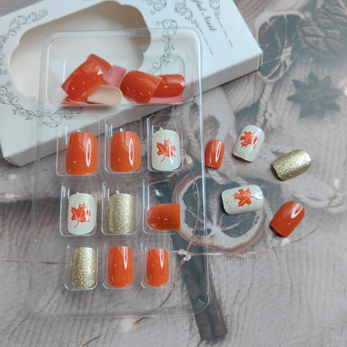 Fall Press on Nails Short Square Fake Nails Maple Leaf Acrylic Nails Thanksgiving Gold Glitter Foil Autumn Glue on Nail Thanksgiving False Nail Cute Maple Leaves Artificial Stick on Nail for Women