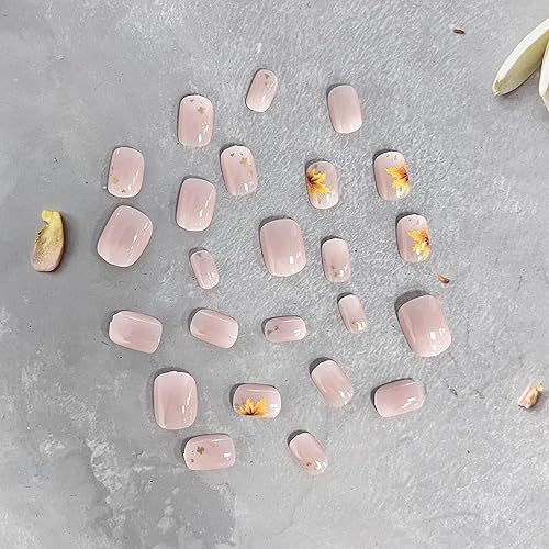 Fall Press on Nails Short Square Fake Nails with Maple Leaf Foil Designs French Gradient False Nails Cute Short Acrylic Press on Nails Glossy Nude Stick on Nails Reusable Artificial Nails for Women