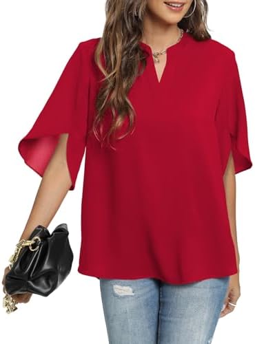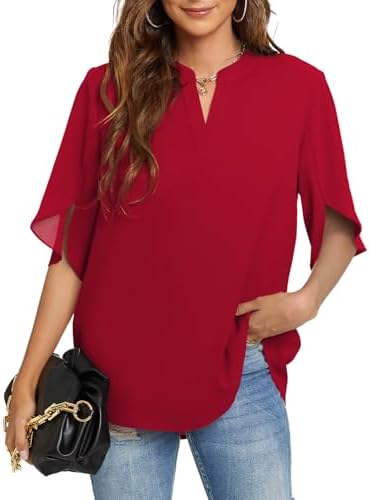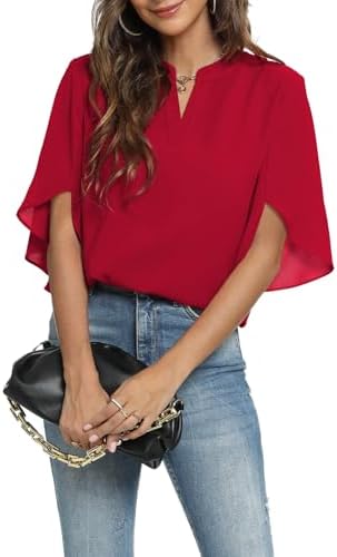 Funlingo Women’s Summer Tops Short Sleeve Casual Shirts V Neck Chiffon Dressy Blouse Tops