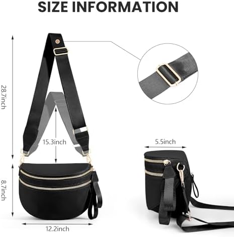 [Multi-Level Storage]: This large fanny packs measures 12.2 x 5.51 x 8.7 inches and features multiple compartments, including front and rear exterior pockets for easy access to your phone, keys, and transit pass; a spacious main compartment for a tablet, wallet, toiletries, and baby diapers; and a hidden zippered interior pocket for valuables like cash and cards.