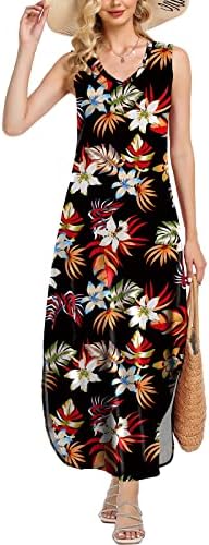 HUSKARY Women’s Maxi Dresses V Neck Sleeveless Long Casual Dresses Loose Sundress with Pocket
