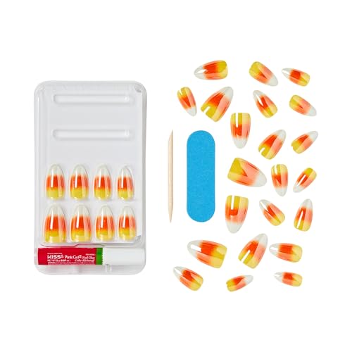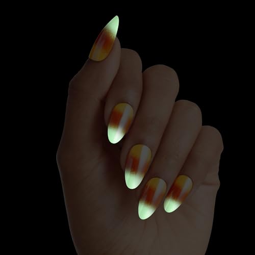 KISS Voguish Fantasy Halloween Press On Nails Almond, ‘Sweet Creature’, Orange and Yellow, Medium Length, Glow In The Dark, Glossy Glazed Effect, Pink Gel Nail Glue (2g), 28 Fake Nails