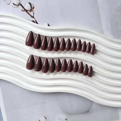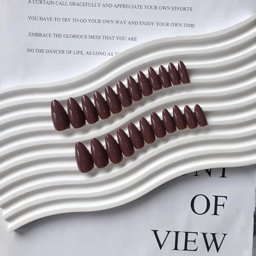 KQueenest Dark Brown Fall Press on Nails Medium Stiletto Almond, Pure Color Acrylic Nails Press ons, Reusable Acrylic Fake Nails Set Feature Protective UV Coating for Women Nail Art Manicure in 24PCS