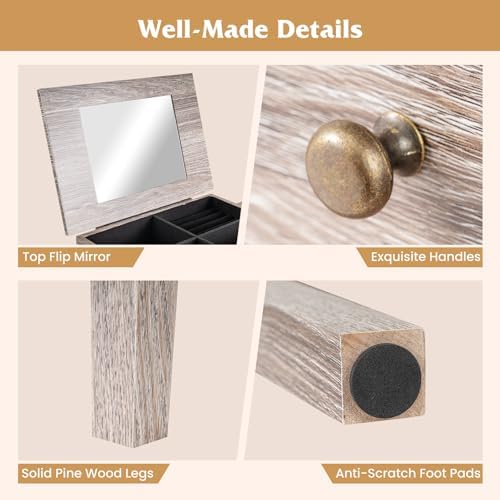 With spacious and well-divided storage compartments, each piece will have its own designated spot. The drawers come in different sizes for versatile storage options. Additionally, the armoire features a flip-top mirror and 2 swing doors that provide extra storage space without compromising on style. Constructed from sturdy wood and equipped with an anti-toppling device, this armoire ensures stability and safety. The built-in velvet liner and protective ropes offer added protection for your jewelry. With its elegant retro design, this armoire will effortlessly enhance your living space.