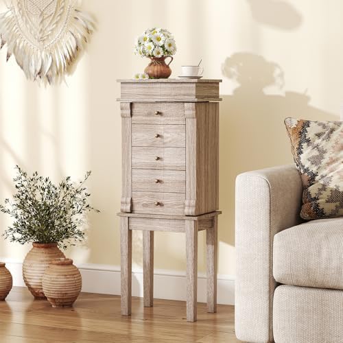 LOKO Standing Jewelry Cabinet, Jewelry Organizer Box With 5 Drawers, 2 Side Doors & Flip Top Mirror, Jewelry Armoire Chest for Necklace, Earring, Space-Saving Design, for Women (Light Gray Oak)