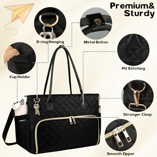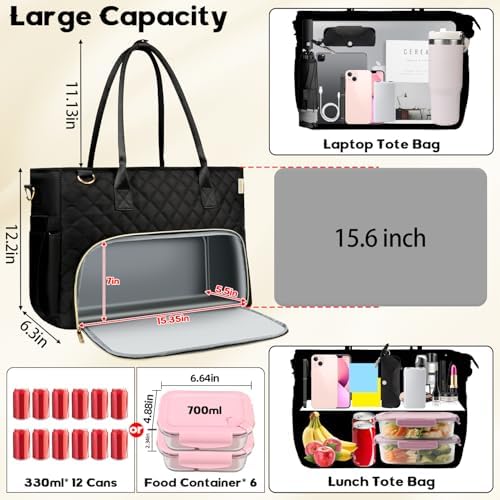 Lunch Tote Bag with 15.6 Inch Laptop Compartment& Water Bottle Pocket, Quilted Nylon Work Tote Bag with Large Insulated Lunch Compartment for Women Schoool Business Teacher Nurse (Black)