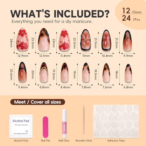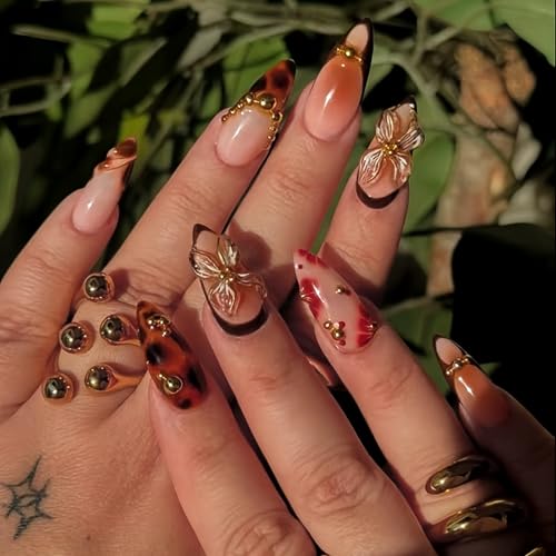 Medium Almond 3D Brown Gold Flower Press on Nails-Sweet & Edgy Leopard French Tip Blossom Gradient Design,24Pcs Semi-Handmade Fall/Autumn/New Year Glue on Acrylic Fake Nail Press ons for Women