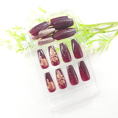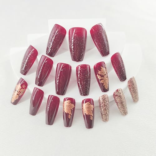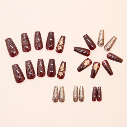 Medium Press on Nails Coffin Burgundy Fake Nails Fall Nails Press ons with Gold Glitter Maple Leaves Design Glossy Glue on Nails Coffin False Nails Medium Stick on Nails for Women 24Pcs