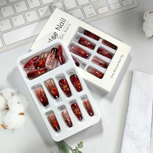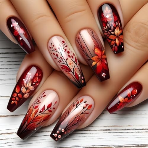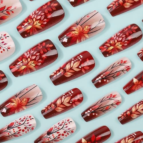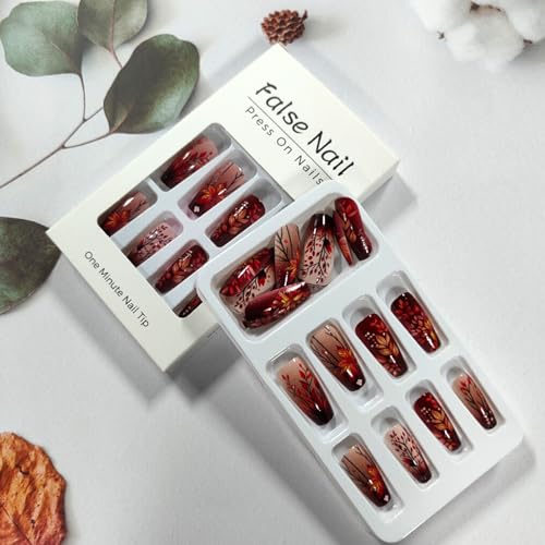 Medium Press on Nails Coffin Fake Nails with Maple Leaf Designs Dark Red Brown Nails Fall Acrylic False Nails Glossy Stick on Nails Full Cover Artificial Glue on Nails for Women 24Pcs