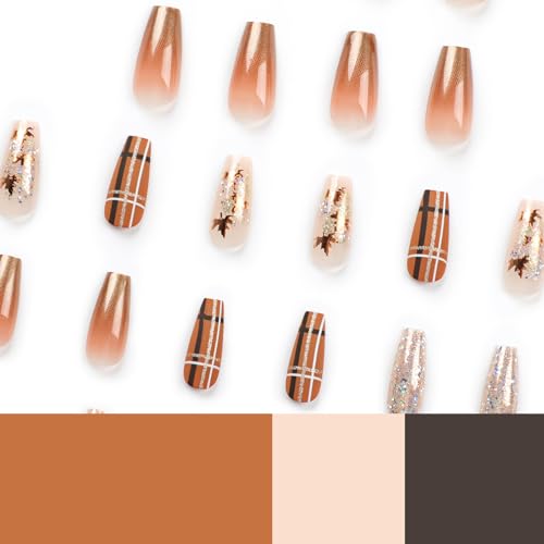 MISUD Fall Press on Nails Long Coffin Fake Nails Glossy Glue on Nails Brown Ombre Acrylic Nails Autumn Maple Leaf Ballerina Artificial Nails Bling Glitter Stick on False Nails with Design 24 pcs