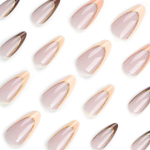 MISUD Fall Press on Nails Medium Almond Fake Nails Glossy Glue on Nails Autumn Brown French Tip Acrylic Nails Stiletto Artificial Nails Bling Glitter Stick on False Nails with Design 24 pcs
