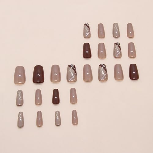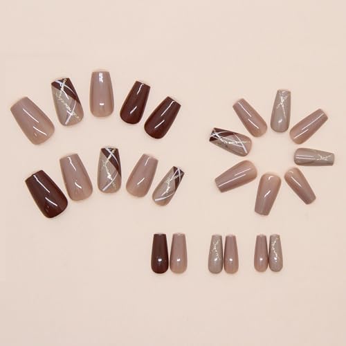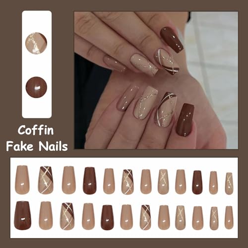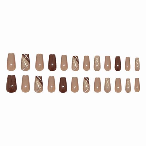 MISUD Press on Nails – Medium Coffin Glue on Nails with Fall Brown, Acrylic Autumn Plaid Design 24 pcs
