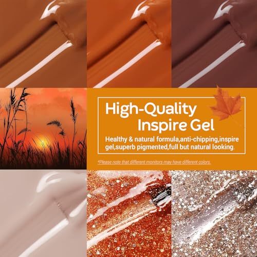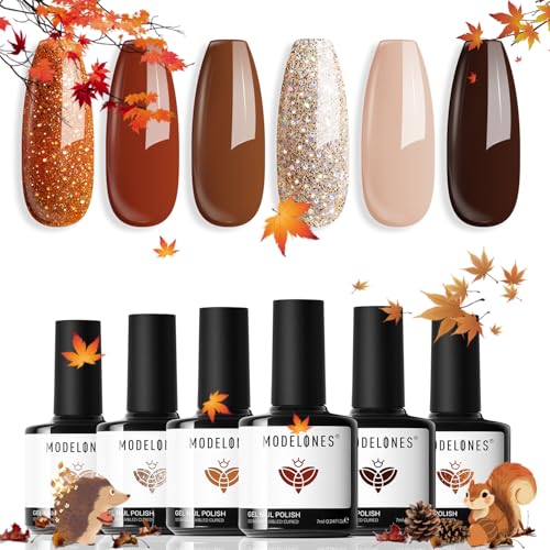 modelones Fall Gel Nail Polish Set, 6 Colors 2025 Neutral Nude Brown Gel Polish Maroon Caramel Burgundy Champane Gold Glitter Nail Polish Cherry Mocha Soak OFF LED Manicure Salon DIY Kit Gift