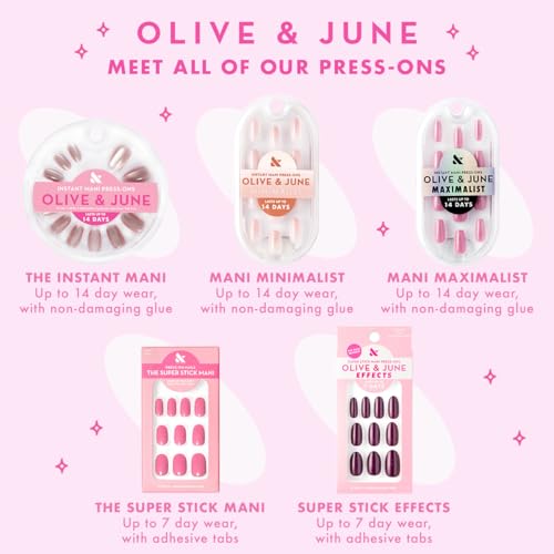 Introducing The Super Stick Mani by Olive & June—the longest-lasting tab press-on manicure on the market with easy on, easy off tabs — on glue needed! The Super Stick Mani delivers a salon-quality manicure in minutes using our non-toxic, non-damaging adhesive tabs and patented tab wheel. No glue required, no mess, and no damage to your natural nails. Each set includes 32 press-on nails in 16 inclusive sizes—more sizes than any other tab mani—for your perfect fit. Custom-engineered for the realest-look and tested on thousands to ensure a perfect fit. For a night out of a week of fun, The Super Stick Mani is your perfect easy on, easy off mani solution. Our adhesive tabs are the longest-lasting on the market, keeping your nails secure for up to 7 days. Ready for your next mani? Removal takes just seconds—no soaking, no scraping. Just pop them off when you’re ready to remove. These press-ons are made from 94% post-consumer recycled materials so they look good and do good. From LA’s hottest salon, straight to your doorstep. Since 2013, Olive & June has been bringing their mission of beautiful nails for everyone to life with their innovative all-in-one systems designed to make salon-quality nails accessible. From polish, to press-ons, to gel— it’s never been easier or more fun to live your best nail life.